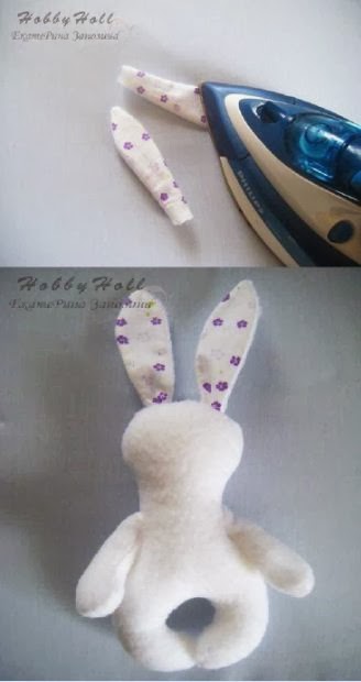Passe a ferro as orelhas para ficarem bem formadinhas. Coloque o enchimento e feche o coelhinho colocando os braços e orelhas no lugar.